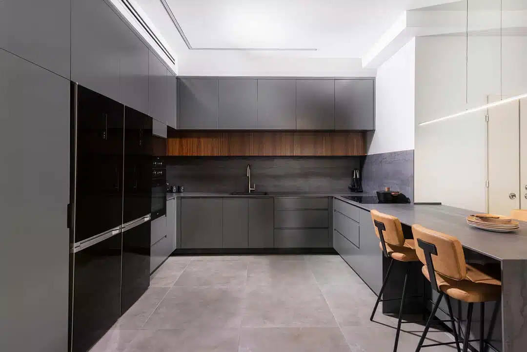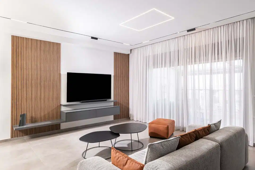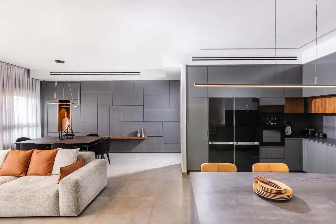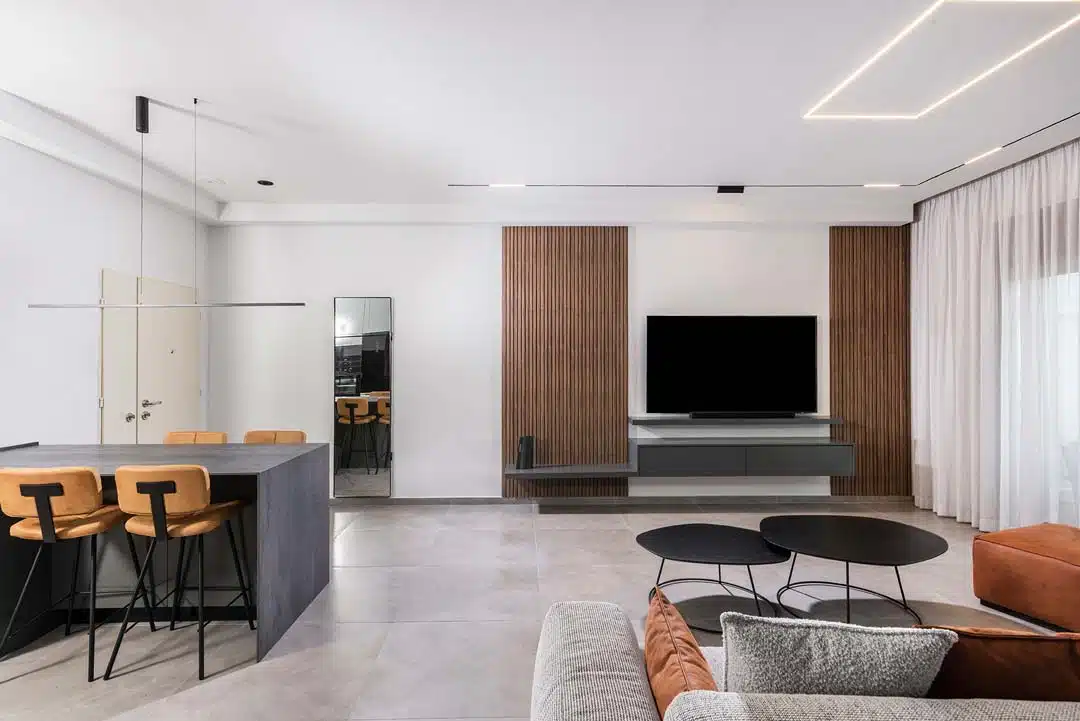 פנטהאוז 6 חדרים בקרית אונו, קיר גדול בולט ומשמעותי בדירה שדרש התייחסות ותכנון עיצובי הכתיב לי את הקו הגוונים והאופי עבור שאר האיזורים בחלל המרכזי.
